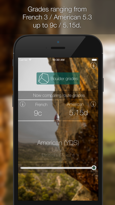 Ever wonder what your climbing grade is in another system? Ever want to compare grades between different styles of climbing? Well worry no longer! In any country, for any climbing rating system, Climbing Grades Converter is a simple, elegant and intuitive tool that seamlessly transitions between climbing grades, for any type of climbing, anywhere you go. Featuring comparable scales for Sport, Trad, and bouldering, this integrated, custom designed app brings beta to the crag at a touch of tape-covered fingers. The easy to use grade converter allows you to select which grades you want to use, and what you’re most familiar with for it to guide you through how to compare your climbing difficulty for any system! Simply select which styles and climbing modes you want to compare and then use the grade slider to flip between different difficulties! Apple Watch: CGC now have a Apple watch app so you easily can translate you grades in a tap by the crag! With Climbing Grades, you’ll get access to all of these climbing systems and history their history: Bouldering grades: • French Fontainebleau grades • American Hueco V-scale • British The Gill 'B' system • British technical grades • Japanese Dankyu system Route grades: • French numerical grades • American (Yosemite Decimal System) • British (Technical) • British adjectival Ewbank • (Australia) Ewbank • (South Africa) Union • Internationale des Associations d’Alpinisme (UIAA) • Swedish / Norwegian • Finnish • Saxon • Brazilian So what are you waiting for? Download this free app and you’re ready to rock! Climb hard my friends, climb hard!