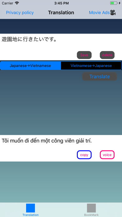 This is the app to translate between Vietnamese and Japanese.Function to read out.Function to clear texts.Function to copy texts.Function to save history.By pressing and holding History Button, you can delete.By lightly touching History Button, you can re-translate.We hope this will be of help to learners of Vietnamese and Japanese.Please use this for learning, business, travel and communication with friends abroad. This app can read out the text of the translation result.If there is anything unclear, please send email to us or write massages on Support Page.