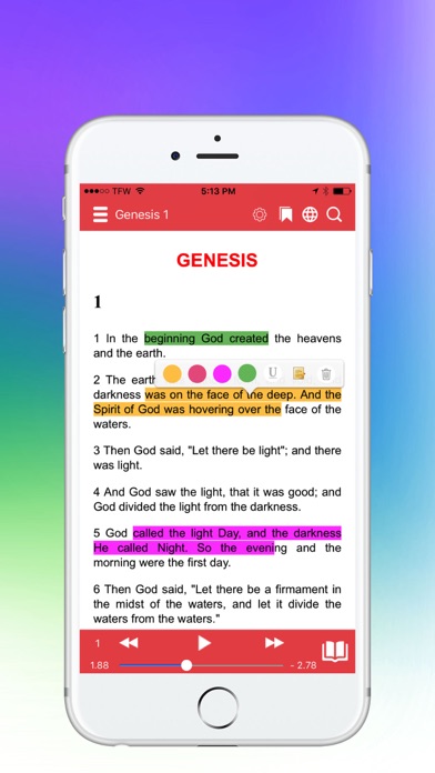 "Only Genesis 1 is Free" Fully Loaded with all features that will make this app easier to read and use. Highlighting Notes taking Underline text Websearch Dictionaries Copy and paste Night and Day mode Two bundle Bible. Fantastic Font size suited for all people with long or short-shortsightedness. The Bible versions are available offline, no internet is required after installation and its so easy to read as two bundled versions. . Full text search with result highlighting and bookmarking. . Write and save personal notes . Read easily with settings like font size and text size. God Bless you All