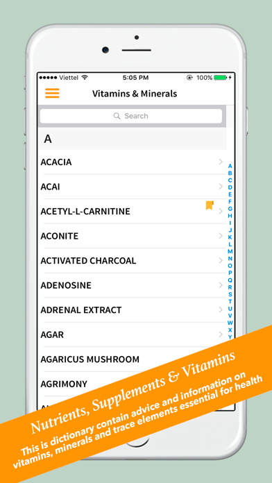 Nutrients, Supplements & Vitamins are essential nutrients because they perform hundreds of roles in the body. This is dictionary contain advice and information on vitamins, minerals and trace elements essential for health, including: - What they do; - How much you need; - what happens if you have too much. - Safety advice about supplements. Main Features: - Offline – It wok offline, no active internet connection is required; - Detailed description of all major Vitamins and minerals; - Equipped with quick dynamic search function – The dictionary will start searching for the words while you type; - Voice search; - Easy way to share with your friends; - Bookmark – you are able to bookmark the Disease Terms to your favorites list by clicking on the “love” icon; - Managing Bookmark Lists – you are able edit your bookmark lists or clear them.