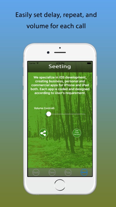 Hunting Calls All in One is one of the smart and accurate tool on the market Specialized tool for Deer Hunters,Run the application and get the attention of All animals,hunters most like to hunt. Hunting Calls is a stunning tool,a collection of different animal sounds which people most like to hunt. This application improves your skills to bring these animals under your hunting rifles and more. Hunting Calls is the most comprehensive collection of animals calls. The most important part is,it includes the information and different key tactics for hunting which make this application very helpful in improving your hunting skills. This application has a very improved and advanced user interface which is very easy to use,and friendly to user,all you need is in front of you,no extra searching and scrolling in the app. Going for hunting? Get Hunting Calls before you leave. This app can produce sounds to call these animals. Why buy different sounds producing devices if you can put all the stuff in your phone. Make sure to verify local hunting laws while going to hunting with this app. Your Feedback is useful for us to improve quality of our application. -Included are all the basic calls that let you call in geese in virtually any situation. The included instructions teaches you basing calling techniques and when and where to use which call. In addition to the call sounds, you'll also receive a short description of each call. With 31 of the most effective predator calls. -You’ll have everything you need to get coyotes and other predators into your set up. -Play calls in succession for an unlimited combination of calls. -You can share also this app on social media that is Facebook, Twitter via Email and/or SMS.