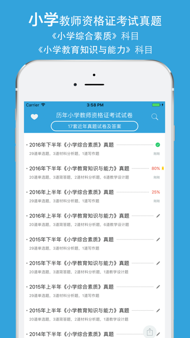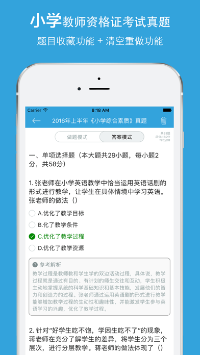 全国教师资格证考试中小学教师历年全国考试题库包含了历年的小学教师资格证考试试卷及答案,《小学综合素质》、《小学教育知识与能力》两科目。 历年小学教师资格证考试试卷如下: 2016年下半年教师资格证考试《小学综合素质》真题及答案 2016年下半年教师资格证考试《小学教育知识与能力》真题及答案 2016年上半年教师资格证考试《小学综合素质》真题及答案 2016年上半年教师资格证考试《小学教育知识与能力》真题及答案 2015年下半年教师资格证考试《小学综合素质》真题及答案 2015年下半年教师资格证考试《小学教育知识与能力》真题及答案 2015年上半年教师资格证考试《小学综合素质》真题及答案 2015年上半年教师资格证考试《小学教育知识与能力》真题及答案 2014年下半年教师资格证考试《小学综合素质》真题及答案 2014年下半年教师资格证考试《小学教育知识与能力》真题及答案 2014年上半年教师资格证考试《小学综合素质》真题及答案 2014年上半年教师资格证考试《小学教育知识与能力》真题及答案 2013年下半年教师资格证考试《小学综合素质》真题及答案 2013年下半年教师资格证考试《小学教育知识与能力》真题及答案 2013年上半年教师资格证考试《小学综合素质》真题及答案 2013年上半年教师资格证考试《小学教育知识与能力》真题及答案 2012年下半年教师资格证考试《小学综合素质》真题及答案 功能有: 小学教师资格考试题目类型有:单项选择题、简答题、材料分析题、教学设计题、写作题,五种题型。 做题模式、答案模式、点击收藏/取消收藏、题目搜索 支持并完美适配所有iOS设备,支持屏幕旋转等。