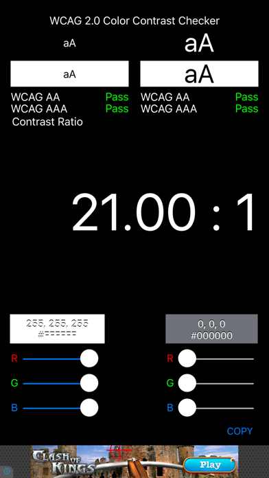 ColorContrastChecker is an application that test has been proposed in the Web Content Accessibility Guidelines (WCAG) 2.0, the color of the contrast ratio achieved standards . The contrast ratio is calculated in real-time two of the color by manipulating the slider of each RGB component , and displays .