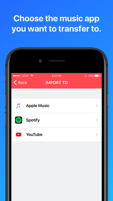 Transfer your playlists between the supported streaming services. • No longer feel locked to a single music service. • Transfer playlists from one music service to another within minutes. • Transfer playlists to YouTube to create music video playlists. • Ability to export a list of songs unable to be matched on the new music service’s song library. • Customer service chat support included within the app. Transfers playlists from: • Apple Music -> Spotify • Apple Music -> YouTube • Spotify -> Apple Music • Spotify -> YouTube Notes: • An active subscription to Apple Music is required in order to transfer playlists to or from Apple Music. • Transferring to YouTube will make your playlists available in YouTube, YouTube Music, and YouTube Red. We are continuously looking to improve the app. If you have any feedback or questions, please reach out to [email protected].