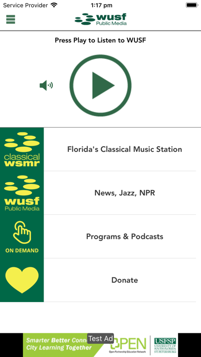 The WUSF App allows you to listen to all of WUSF’s programs. The app provides On-Demand content of all your favorite shows, live streaming of the radio channels, WUSF 89.7 and Classical WSMR 89.1 and 103.9 in addition to FM Radio Schedules. Easily explore additional content. Live Streaming: • Listen to live streams from WUSF even while travelling! Start the app and your favorite station starts playing. • One Click stream switching – flip over to the program you noticed on another channel with a single click. • Listen to WUSF in the background while browsing the Web or catching up on your emails! On Demand: • Access WUSF’s programs easily and quickly, Florida Matters and University Beat. • Access WUSF’s FL Matters podcast. • DVR-like controls Pause, rewind and fast forward your program with ease. • When accessing programs, individual segments (when available) are listed so you can review and choose one or listen to the entire program. • Easy to access past programs • The WUSF Public Media App displays the web page associated with the program or program segment you are listening to On Demand so you can explore for more information. Additional Features: • Connected Car – Apple Car Play – connect with WUSF in your car. • Upstream – Submit video, audio and photos through the App. • Notifications of important information and changes. • FaceBook and Twitter Integration • Weather • Program schedules • A built-in-Sleep Timer and Alarm Clock allows you to go to sleep and wake up to your favorite station. The WUSF Public Media app is brought to you by the people at WUSF and jācapps. We work to provide our valued listeners with great solutions to find what you want, when you want it, and where you want it. Please support WUSF Public Media by becoming a member today! http://www.wusf.org