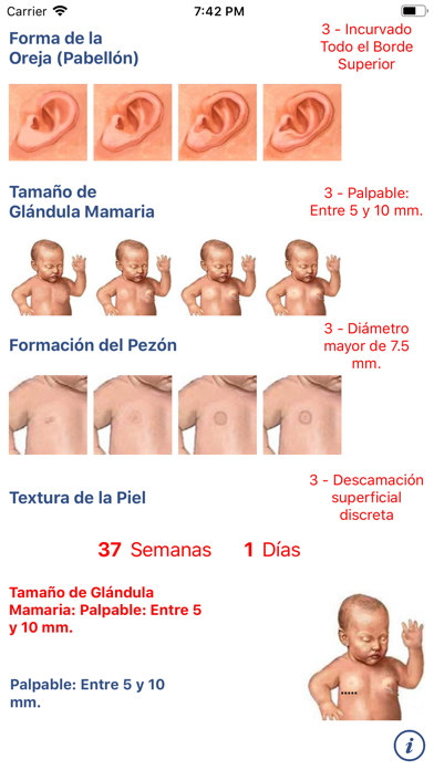 La App Neonatología: Método de Capurro te permite estimar la edad gestacional de un neonato considerando y seleccionando cinco parámetros fisiológicos y diversas puntuaciones que combinadas dan la estimación buscada. Este es el método ideal que se ha de utilizar si el recién nacido presenta depresión neurológica. Los criterios evaluados en el Método Capurro son: 1.- Forma de la Oreja (Pabellón). 2.- Tamaño de la Glándula Mamaria. 3.- Formación del Pezón. 4.- Textura de la piel. 5.- Pliegues Plantares. Clasificación: Postmaduro: 42 semanas o mas. A Término: 37 a 41 semanas. Prematuro Leve: 35 a 36 semanas. Prematuro Moderado: 32 a 34 semanas. Prematuro extremo: Menos de 32 semanas. Esta aplicación la pueden utilizar medicos, enfermeras y cualquier persona relacionada con el cuidado de la salud de una forma sencilla e intuitiva, dando una inmediata respuesta seleccionando las opciones de cada categoría. La información contenida en esta aplicación no pretende ser un sustituto de consejo médico profesional o tratamiento de emergencia. No use esta información para diagnosticar o para desarrollar un plan de tratamiento para un problema de salud o enfermedad sin consultar a un medico calificado. si estas en una situación médica que amenaza la vida o de emergencia, busque ayuda médica de inmediato. Comentarios y Sugerencias http://maddevsoftware.wordpress.com Soporte Técnico Contáctanos en [email protected]