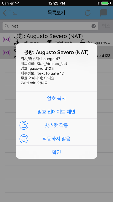 WiFox는 전 세계의 공항 및 라운지 WiFi 암호를 지속적으로 업데이트하는 지도입니다. 지도 보기에서 무선 정보를 사용할 수 있는 WiFi 아이콘을 탭한 다음 버튼을 사용하여 암호를 클립보드로 복사할 수 있습니다. 이 지도는 오프라인에서 사용할 수 있으므로 여행 중에 WiFox를 사용하기 위해 인터넷에 연결할 필요가 없습니다. * 복사를 클릭하면 무선 네트워크 설정에 암호를 쉽게 붙여 넣을 수 있습니다. * 전세계 공항에서 찾은 암호를 사용자가 추가할 수도 있습니다. 이후 이 암호는 foXnoMad에 전송되어 확인 및 승인 단계를 거친 후 지도에 추가됩니다. * '목록보기'에서 이미 추가 된 공항의 암호를 업데이트 할 수 있습니다 (변경 사항을 확인한 경우). 여행 할 때 무선 핫스팟 정보를 평가하여 세부 사항의 작동 여부를 알려주십시오. 여행자 피드백을 기반으로 연결 정보가 업데이트, 확인 또는 제거됩니다. * WiFox 아이콘은 공항의 무선 네트워크 정보가 얼마나 최신이고 신뢰할 수 있으며 높은 평가를 받았는지를 나타냅니다. * WiFox는 여행자, 조종사 및 기타 사용자가 WiFox 앱, foXnoMad 웹사이트 및 Facebook과 Twitter 계정을 통해 전송하는 정보를 지속적으로 업데이트합니다. WiFox는 현재 전 세계 700 곳이 넘는 공항에 대한 무선 인터넷 정보를 제공합니다. *이 지도는 앱을 열 때(인터넷에 연결되어 있는 경우) 또는 지도에서 '업데이트'버튼을 클릭하거나 목록보기에서 새로 고침 아이콘을 클릭하는 경우 자동으로 업데이트됩니다. * WiFox는 또한 적합한 네트워크 이름을 알려주어 무료 (개방형) Wi-Fi 네트워크의 사용자를 보호하므로 원하지 않게 악성 또는 악의적 액세스 포인트에 연결되는 일이 없습니다.