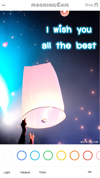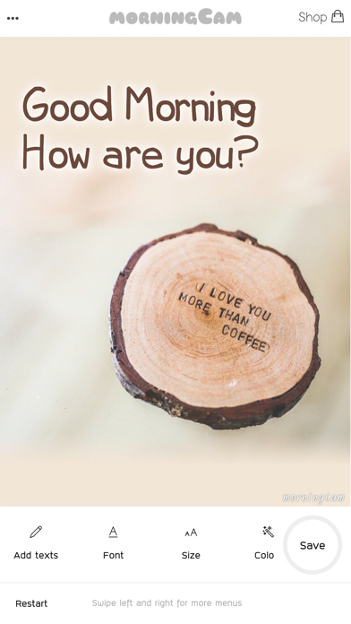 morningCam is a free photo app that lets you create good morning and greeting photos easily. With just a couple of touches, you will have your personal greeting photo ready to be sent to your family and love ones. morningCam lets you add texts to photo and edit/add effects to the texts to make it looks well with the photo you select. It is one of the most easiest photo apps out there that made specially for everyone of all ages. Main Features ========== ・ Greeting texts are prepared in advanced for you ・ You can simply pick your favourite greeting texts and then save the photo ・ You can type in your own custom texts ・ 10 cute fonts are available in the app ・ Text's position is moveable ・ Text's size is changeable. ・ Text's color is changeable. ・ Text's stroke color is changeable. ・ Text's shadow color is changeable. ・ Text's alignment color is adjustable. ・ Support camera ・ Support device's photo albums ・ You can share your photos on Facebook, Twitter, Instagram and more. ・ The app works on both iPhone and iPad Other information ============ - You can submit feedback and bug reports to: [email protected] - For Thai version, please go here: http://goo.gl/J3mMrQ - เวอร์ชั่นภาษาไทยสามารถโหลดได้ที่นี่ครับ http://goo.gl/J3mMrQ