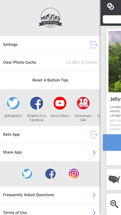 Aerial Camping is a community-driven photo sharing service geared toward aerial photography and camping. Aerial Camping offers ratings and reviews for campgrounds, directions, open-community posting of photos and much more. Users can like and comment on user-submitted photos, create hashtags and even mention and reply to other users. Aerial Camping utilizes Yelp to easily find and create campgrounds. ° Post and share aerial photography ° Comment and Like others photos ° Rate and Review Campgrounds ° Moderate your own Campground listings ----- NOTICE: AERIAL CAMPING CONTAINS USER-GENERATED CONTENT. IF YOU FEEL THAT A PHOTO VIOLATES OUR TERMS OF SERVICE (http://aerialcamping.wrightscsapps.com/help/legal/index.php?doc=terms) OR OUR COMMUNITY GUIDELINES (http://aerialcamping.wrightscsapps.com/help/legal/index.php?doc=community), YOU MAY CONTACT US DIRECTLY AT ([email protected]) OR USE THE FLAG FEATURE WHEN VIEWING PHOTOS.