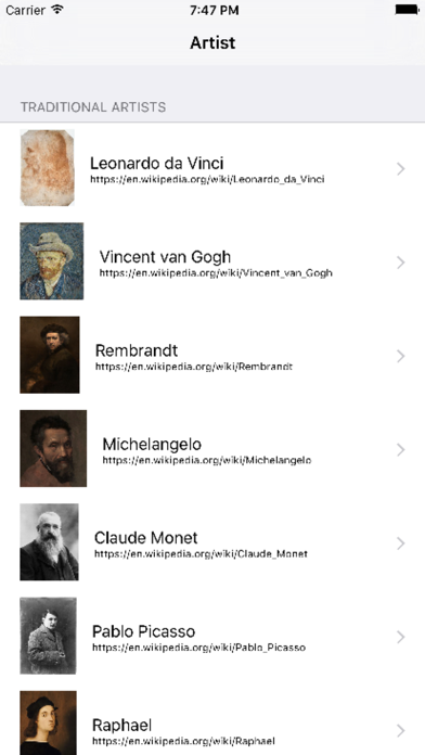 Master Artists helps you explore the most influential artists of all times. Begin with traditional artists and come to know the life and works of the old masters. Continue learning about art with the most important modern artists of our time. An easy to understand list is provided for you. Simply touch the artist you want to learn more about and off you go into the wonderful world of art! Traditional artists available include: Leonardo Da Vinci, Vincent van Gogh, Rembrandt, Michelangelo, Monet, Picasso, Raphael, Renoir, Vermeer and Cezanne. Modern artists available include: Jon Kevin Olivet, Ai Weiwei, Jeff Koons, Yayoi Kusama, Damien Hirst, Yoko Ono, Theaster Gates, Frank Stella, Tania Bruguera, Alex Katz and Cindy Sherman.