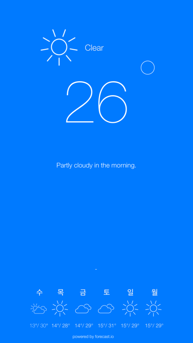 간단하고 최소한의 날씨 앱. > 우아하고 심플한 디자인 > 현재 GPS 위치 정도 버튼을 눌러> 섭씨 또는 화씨 아래쪽을 통해 날씨> 데이터 업데이트 와이프 > 날씨 데이터는 forecast.io에서 온 + 오늘 우산을 필요로 할 때 알림을 수신 오늘 너무 바람이 부는 경우 + 알림을 수신 아주 뜨거울 때 + 알림을 수신 + 날씨 경고 응용 프로그램은 필요한 위치에 정부 기관에서 발행 한 날씨 경고를 보여줍니다. 스카이 블루는 현재 한국어를 지원하지 않습니다. [email protected] 어떤 의견을 보내주십시오. 그리고 요금이 응용 프로그램을 검토하여 주시기 바랍니다.