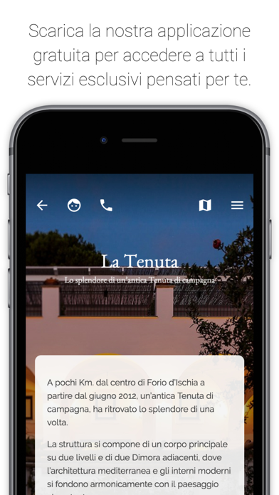Cosa vedere, guida viaggi, eventi, i servizi dell’hotel e della città, tutto quello che ti serve per la tua vacanza a Ischia si trova sulla nostra app e sul tuo smartphone a portata di mano! A pochi minuti dal centro di Forio d’Ischia un’antica Tenuta fonde antico e moderno. Il cuore della Tenuta è l’ampia terrazza con piscina balneare circondata da uno splendido giardino di macchia mediterranea che affaccia sulla incantevole baia di Citara. Scarica la nostra applicazione gratuita per accedere a tutti i servizi esclusivi pensati per te.