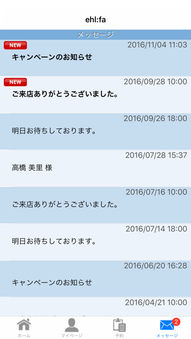 北野田と長吉のに美容室を展開するehl:faアプリが遂に誕生!! ■24時間いつでもネット予約 ・わずか4ステップで予約が可能! ・担当者のスケジュールが確認できるので、都合の良い日時での予約が可能! ・名前や住所、メールアドレスなどのわずらわしい入力は一切不要! ■マイページ機能 ・ご利用可能ポイントが確認でき、次回ご来店時に使用可能! ・前回のご来店日時が確認でき、次回ご来店の目安に! ■メッセージ機能 ・ご予約日お知らせメッセージ配信 ・お得な情報メッセージ配信