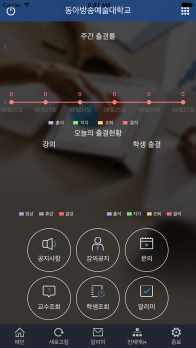 동아방송예술대학교 전자출결시스템 1. 강의출결 2. 시간표조회 3. 휴보강조회 4. 이의신청 5. 공결신청