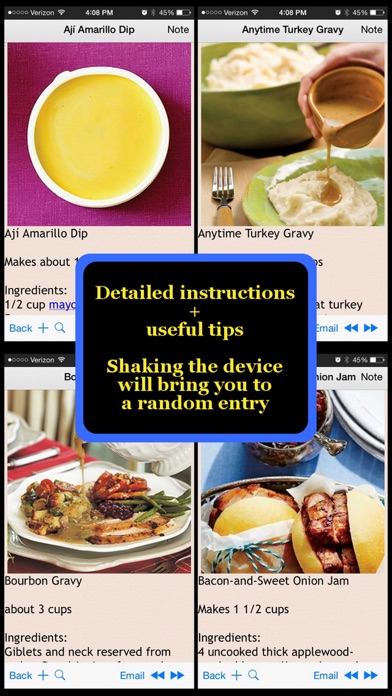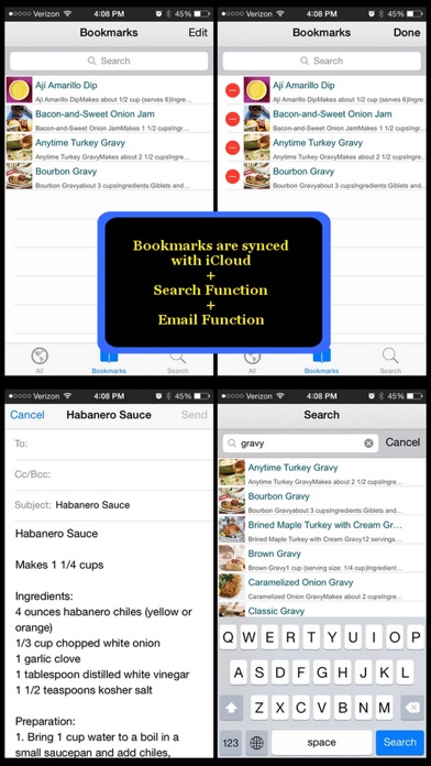 ** 50% Off Today!! ABOUT THIS APP ======================== Gravy and Sauce Recipes is an application containing over 500 detailed cooking recipes that includes gravy, sauces and dressing. For each recipe included in this App, a photo, an ingredient list, a step by step cooking direction, and a detailed nutritional table is provided. The application is optimized for iPad/iPad2/iPad mini, iPhone 3GS/4/4S/5/5S/5C/6/6+/6S/6S+ & iPod Touch. FEATURES ======================== This application has the following features: * A user friendly interface with THUMBNAIL preview of each recipe * Ability to BOOKMARK selected recipes for easier reference * Add a CUSTOM NOTE to any recipe * iCloud synchronized Bookmarks and Custom Notes * EMAIL any items to yourself & friends * A recipe SEARCH engine * Enter a RANDOM entry when shaking the device (if you cannot make up your mind) * OFFLINE browsing ======================== This App is brought to you by audio128.com