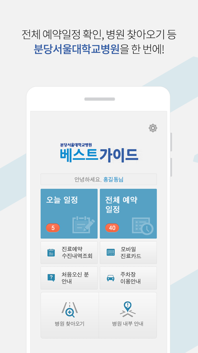 베스트 가이드 서비스로 보다 나은 의료 서비스를 경험해 보세요. 대형병원은 진료 절차도 여러 단계이고 실내 구조가 복잡해 길을 찾아가기도 어렵습니다. 따라서 노약자는 물론이고 일반 성인들도 의료진이나 직원들에게 물어가며 진료를 볼 수 밖에 없는데 분당서울대학교병원에서는 이런 환자의 어려움을 해소하기 위해 Best Guide 서비스를 도입 했습니다. 스마트폰 앱으로 이용 할 수 있는 이 서비스는 전체 예약현황, 그날의 진료 및 검사 일정과 상세내용, 진료비 수납안내, 설문조사, 일정 완료여부 등 모든 단계 마다 해야 할 일에 대한 정보를 실시간 으로 알려드립니다. 또한 진료실이나 검사실, 식당 등 병원 안네서 가야 할 곳의 위치를 자동으로 찾아주고 3D내비게이션으로 경로 안내를 해드릴 수 있어 보다 편리하게 병원을 이용 할 수 있습니다. 고객 여러분의 복잡한 프로세스와 경로를 분석해 개인에게 필요한 최적의 정보를 알아서 제공하는 지능형 환자 안내시스템인 베스트가이드! 베스트 가이드 서비스로 보다 나은 의료 서비스를 경험해 보세요.
