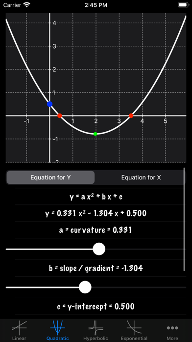 This app is great for scholars and parents wishing to understand graphs in mathematics. While there are many graphing calculators that allow you to graph many complex functions, this one focuses on teaching simple math graphs in a really simple and visual way. Using sliders to change the values of variables, you can see the impact the variable has on the overall equation or function, as well as other interesting things like x and y intercepts, local and global minimums and maximums, inflection points, and asymptotes. You will quickly grasp just how simple graphs are by watching them change shape and move around as the value of a variable becomes larger or smaller or goes from positive to negative, or zero. Even parents will wish they had this app when they went to school, as they too will grasp just how easy and fun math is. Specifically, the following graphs are included: 1. Lines of the form y = mx+c or ax+b 2. Parabolas or Quadratics of the form y = ax^2+bx+c 3. Hyperbolas of the form y = a/(x+b)+c 4. Exponentials of the form y = ab^x+c 5. Trigonometric function (sin, cos, and tan) of the form y = a*sin(bx)+c or a*cos(bx)+c or a*tan(bx)+c 6. Cubics of the form y = ax^3+bx^2+cx+d 7. Quartics of the form y = ax^4+bx^3+cx^2+dx+e You can also pan around the graphs and pinch to zoom in and out, and just tap the graph to reset the pan and zoom. You can also see the functions in the form of x = f(y). Enjoy learning math graphs, and drop me an email if you would like me to include a couple of other graphs that you or or children are struggling with.