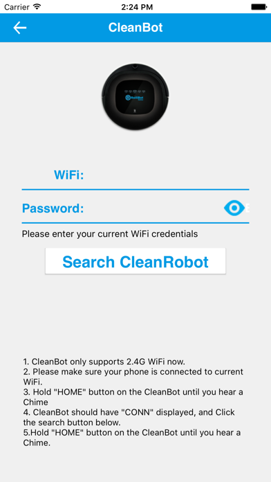 CleanBot vacuum cleaner is designed for floor sweeping, vacuum and mopping. The CleanBot app can help you control your CleanBot vacuum cleaner anywhere. With the app, you can 1. Start and stop your CleanBot. 2. Set up schedule for your CleanBot. 3. Move your CleanBot manually. 4. Check the CleanBot's status. Register your CleanBot account, and control your CleanBot anywhere, anytime. Note: CleanBot vacuum cleaner needs to access Internet by using 2.4G wifi.To control the CleanBot, your mobile phone also needs to access Internet.