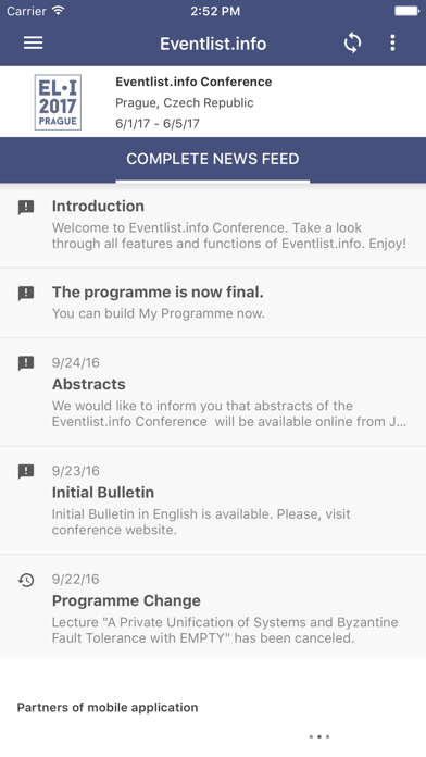 Modern application for congresses, conferences and other events. The benefits and advantages of the Eventlist.info mobile app: - Simple and intuitive control for users - Fast start also at major international events with an comprehensive programme and large number of speakers and authors - Manage all data via the Eventlist.info administration interface - you don't need programming skills - App may be only for selected users (password security) - Complete programme/posters/symposia in one simple EXCEL table - Well-arranged scientific programme divided by days, halls and blocks of lectures - List of all authors and co-authors and their institutions (universities, countries, etc.) - Lectures abstracts - News, program changes and their simple and fast administration - Lectures and posters ratings, questionnaires, surveys - Creating your own program, start notifications for selected lectures - Maps of important places including integration with navigation (venue, hotels, places of social events) - Own photo gallery - Event partners including a breakdown by category (logo + url link) - App partners on the main page (logo + url link) More information at http://www.eventlist.info or contact us at [email protected]