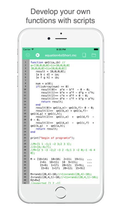 Math-c is a light and simple math script application and interactive environment for mathematical calculation, programming, plotting and image processing. Features • It allows you to create nested structures and script programs • It allows you to use functions for linear algebra. • It provides built-in graphics to analyze data and options to customize these plots. Uses of Math-c mathematical calculations Math-c can be used for many mathematical calculations like the following: • Arrays • Matrices • 2D and graphics • Linear Algebra • Quaternions • Complex numbers • Work in hexadecimal and binary format Areas where Math-c can be of benefit Math-c can be used as a simple tool in math, programming, chemistry, physics, engineering and in applications as the following: • Signal Processing and Communications • Image Processing • Fourier analysis • Mathematical Calculations Learning and documentation ・Documentation section in the website. ・Email support We appreciate your positive reviews into the App Store and your feedback to [email protected] so you can help us give you a better service.