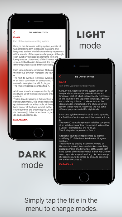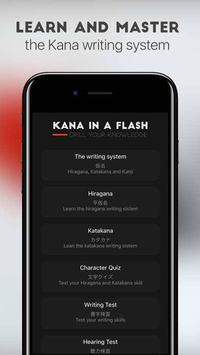 Kana In A Flash is an instrumental app for learning and mastering the Japanese writing system. It features a complete reference of all Hiragana and Katakana characters along with the grammatical rules and special combinations. Test and drill your knowledge with custom quizzes and tests. Learn faster and more efficiently. Features: - Quickly and efficiently learn all Hiragana and Katakana characters - See the symbols and hear their pronunciations - Drill and master your knowledge with the letter quiz - Practice writing with the writing test - Practice your hearing skills with the hearing test - Light and Dark mode (simply tap the title to switch modes) - Quickly launch your favourite feature with 3D touch - Optimised for all iOS devices - Beautiful minimalistic design