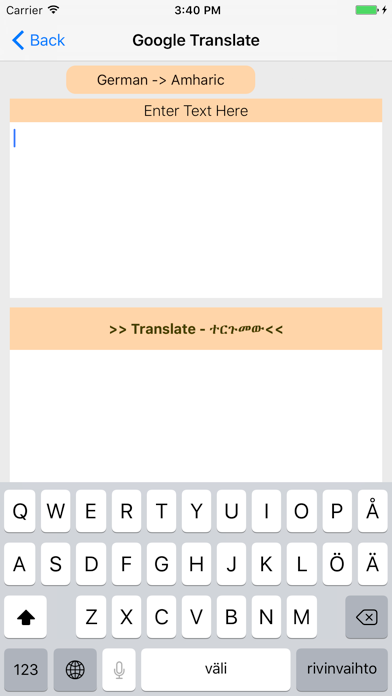 Amharic German Dictionary This is an essential Amharic German dictionary with German to Amharic Translator. It is a quick reference IOS dictionary app. It is easy to use with a practical approach. The app can be used as Amharic German Translator and also German Amharic Translator. If you need further translation of Amharic to German or German to Amharic, you can use Translator found in this app. The Application has a built in Amharic keyboard. The keyboard has all geez letters you need to write and search Amharic words from this dictionary. Thank you very much for installing this app.