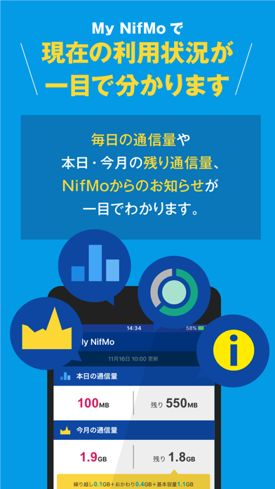 「My NifMo」は、通信量の確認や、NifMoに関するお知らせやサポート情報に簡単にアクセスできるNifMoユーザー必携のアプリです。 ●本アプリの特徴 ・データ通信の使用量をチェック! 3G/LTEによるデータ通信使用量が確認できます。 「通信量明細」画面では、直近3日間、直近3カ月間の通信量も確認することも可能です。 ・NifMoからのお知らせ メンテナンス、トラブル情報や新サービス、キャンペーンのご案内など、NifMoからの最新情報を参照できます。重要な情報は、アプリを起動しなくてもプッシュ通知でご案内。 ・各種お手続きや会員サポートページへのリンク。 NifMoに関する各種お手続きやサポート情報、お問い合わせ窓口にも簡単にアクセスできます。 ●注意点 ・My NifMoは、@niftyの音声通話対応スマートフォンサービス「NifMo」をご利用中の方のみがご利用いただける会員専用アプリです。 ・ご利用には、ご契約時にお送りした@nifty IDとログインパスワードが必要となります。 ・本アプリによる通信量の取得につきましては、多くのお客様に快適にご利用いただくため、取得頻度に制限を設けております。そのため、最新の通信量が表示されない場合があります(通信量情報の更新時間については、アプリ画面上に表示されております)。最新の通信量は、通信量明細画面の右上のメニューより「ご利用状況照会」を選択の上、ご利用状況照会のページからご確認いただけます。