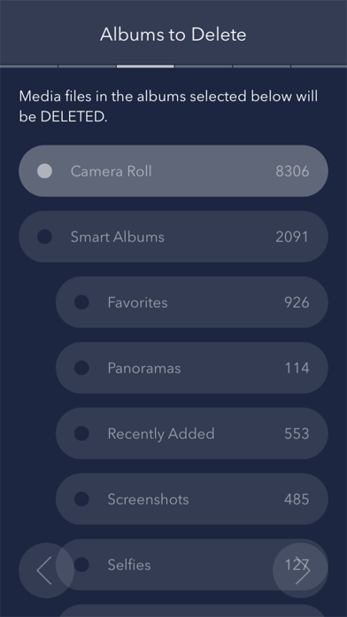 Simple photo and video cleaner. You can select albums to delete and albums to keep then easily manage (delete / favorite / unfavorite / add to new album) the selected media files. For instance, you can delete all videos except favorited ones or delete all media that are not added to any user albums. Useful when you have too many media on your device already backed up somewhere.