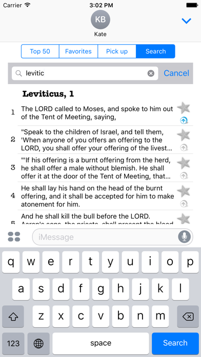This is a quote former for iMessage. You can easily select a verse from the Bible text (NHEB source is used) and insert it into an iMessage chat with one movement of your finger as a valuable argument in conversation. The sent message contains both the full text of the verse itself and a reference (Book, chapter, verse). The Bible can be searched by book, chapter, verse, or by full text search. Also, you can mark any verse as a favourite. While the application is used, we gather statistics (locally) and show most frequently used quotes in the Top 50 view. Tap on star or swipe left on the screen to manage your Favorites list. Please let us know if you would like this app to become available in another language.
