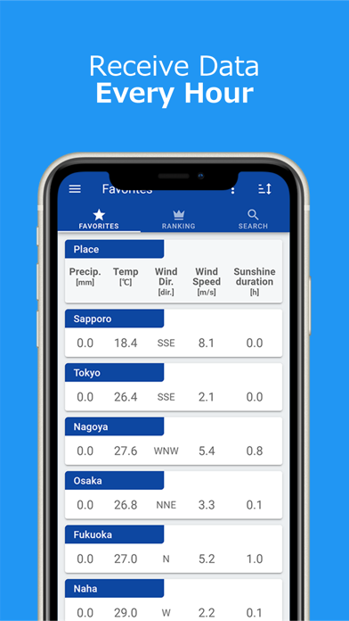Viewer for weather observations data of all over Japan. [Data] Temperature, Precipitation, Wind direction, Wind speed, Sunshine duration, Snowdepth, Humidity, Pressure. [Feature] - Reciving Data every hour from Japan Meteorological Agency. - "Add to Favorites" function for checking several stations weather observation data in a list. - Simple and Easy UI design.