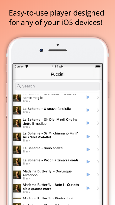 • • • • • • • • Check it out! • • • • • • • • Enjoy Mozart's music anytime. Available on iPhone/iPad. Runs in background mode. ◆◇◆ Core Features ◆◇◆ • Fast loading • No registering needed • iPad ready ! • HQ sound. • Simple, fast and easy to use interface. • The application runs in the background. TRACKLIST 1. La Boheme - Donde lieta usci' 2. La Boheme - Dunque e' propio finita! 3. La Boheme - In un Coupe O Mimi tu piu' non torni 4. La Boheme - La commedia e' stupenda! Quando m'en vo Fuori il danaro! 5. La Boheme - Non sono in vena! Si sente meglio 6. La Boheme - O soave fanciulla 7. La Boheme - Oh Dio! Mimi! Che ha detto il medico 8. La Boheme - Si' Mi chiamano Mimi Aria 'Ehi! Rodolfo! 9. La Boheme - Sono andati 10. La Boheme - Vecchia zimarra senti 11. Madama Butterfly - Dovunque al mondo 12. Madama Butterfly - Acto I - Quanto cielo quanto mare 13. Madama Butterfly - Bimba dagli occhi piani di malia 14. Madama Butterfly - Maria Callas - Un bel di vedremo 15. Madama Butterfly Act I Amore o grillo 16. Madame Butterfly - Maria Callas • • • • • • • • Check it out! • • • • • • • •