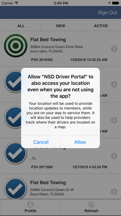 Allows drivers to see assigned dispatches, interact with NSD Dispatch Center and service alerts, share driver location and ETA count down for customer. DISCLAIMER: Continued use of GPS running in the background can dramatically decrease battery life.