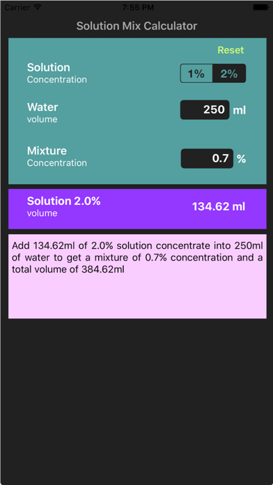 Calculates the volume of solutions 1% or 2% of any substance that needs to be dissolved in water in order to get a mix of the desired concentration of the substance. Example, I have a solution of 2% concentration of a substance and would like to dissolve it in 250ml water to get a mixture with concentration of 0.7% of the substance. The app will calculate the solution 2% volume that you need, i.e. 134.62ml!