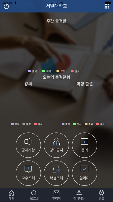 서일대학교 스마트출결관리시스템 1. 강의출결 2. 시간표조회 3. 휴보강조회 4. 이의신청 5. 공결신청
