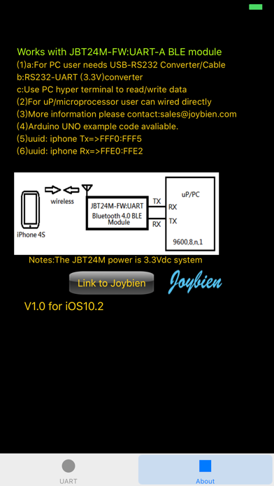 *****This App works with JBT24M-PA/CA Bluetooth 4.0 BLE module***** *****Needs some hardware to co-work***** Use Joybien JBT24M-PA/CA module to link iPhone 4S/5 and microprocessor/PC based device wirelessly for Serial Data communication over air. This App software along with JBT24M-PA/CA Bluetooth 4.0 module facilitates wireless serial communication from/to the microprocessor/PC to/from iPhone 4S/5 Hardware accessories required: For PC User (1)USB-RS232 Conveter/Cable (2)RS232-UART(TX/RX) Converter (3)Use PC Hyper Terminal to read/write iPhone data. For uP/uC (microprocessor/microcontroller) user (1)uP/uC needs UART port support (2)User needs programming the code for uC/uP Arduino UNO example code available. JBT24M-CA/PA with FW:UART supports Baud Rate:9600,8,n,1 protocol. Use 20 bytes data two way communication provides small data communication. if you need more communication protocol/information please contact [email protected] App Features: (1)Send out data (2)Receive data (3)Check advertisement data, RSSI,Local Name and UUID (4)uuid: iPhone TX=>FFF0:FFF5 (5)uuid: iPhone RX=>FFE0:FFE2 The video demo link address as following: http://www.youtube.com/watch?v=eESBNJgSlGw