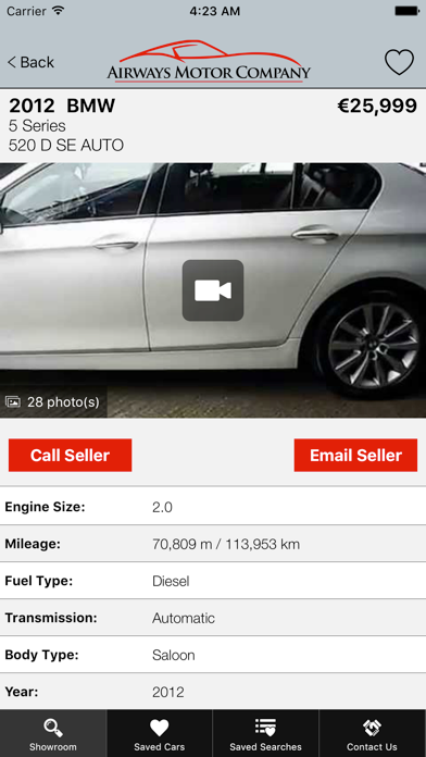 Search our used cars showroom with the free Airways Motor Company app for iPhone and iPad. FEATURES: - Search cars for sale by make, model, year, price, county & many other options - Details include fuel economy data, safety and green rating - Save search criteria - Fully optimised for iPhone and iPad users - Save cars on your device viewing later - Create you own notes for any car - Share used cars on social media - Get directions to our premises