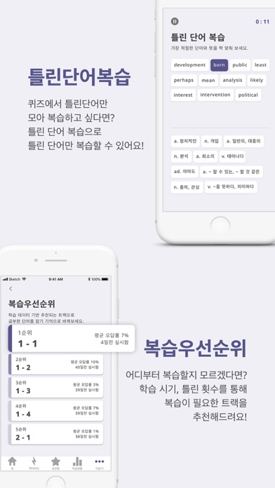 데이터로 입증된 적중률 1위 수능, 공무원 영어 단어장! 학습자 수준과 모르는 단어를 분석하고 자동 복습 제공! 시중에서 판매되는 책과 함께 연계학습으로 암기 효율 UP! UP! 1. 데이터로 입증된 적중률 1등 워드캐스트 - 1등은 단 하나뿐! 평균 적중률 86%! 데이터로 입증된 1등 적중률의 영어 단어장은 워드캐스트 단 하나뿐입니다. 워드캐스트는 빅데이터 전문 분석 기업, 영어 학습 전문가, 교육 전문 기업이 함께 만들었습니다. - 적중률 분석 포스팅 : http://blog.naver.com/9stairs/221057283692 2. 사용자에 따라 변하는 1:1 맞춤 학습 - 체계적인 학습자 분석! 워드캐스트는 사용자 어휘력 테스트를 통해서 사용자의 어휘 수준을 분석하여 최적화된 학습 내용 및 학습량을 추천합니다. 또한, 앱에서 제공하는 퀴즈를 풀면, 결과를 분석하여 틀린 단어들을 표시해주고, 자동 복습까지 제공합니다. - 사용자 맞춤학습 포스팅 : http://blog.naver.com/9stairs/221060060685 3. 진짜 빅데이터 - 가짜 빅데이터는 가라! 시중의 단어장들이 10,000개도 안 되는 기출 문제를 분석하고 “빅데이터로 분석한”이라는 이야기를 합니다. 워드캐스트는 1개의 단어장을 만들기 위해 537,023,067개 이상의 “진짜 빅데이터”를 분석하여 사용합니다. 활용 데이터 리스트 : 영어 원문, 실제 기출 문제, 교육부 지침, 초등 단어, 중등 교과서 등 - 17년 9급 지방직 분석 포스팅 : http://blog.naver.com/9stairs/221034497891 4. 검증된 기출 단어 예측 시스템 - 말로만 떠드는 기출 단어 예측은 이제 그만! 빅데이터로 기출 단어를 예측하기 위해서는 고도화된 예측 시스템이 있어야 합니다. 워드캐스트는 빅데이터를 분석하여 실시간으로 단어장을 제작 할 수 있는 기출 단어 예측 시스템을 제작하였습니다. 또한, 시스템의 분석 속도, 적중률, 불필요 단어 제거 등에 대한 검증을 TTA를 통해서 받았습니다. 이 시스템을 통해 워드캐스트가 제공하는 단어장은 총 6종이고, 차후 소방직 공무원 등 다양한 시험별 단어장을 제공할 예정입니다. 현재 제공하는 단어장 리스트 :수능 영어, 9급 공무원(국가직, 지방직, 서울시), 7급 공무원(국가직, 지방직, 서울시), 경찰공무원, 법원직 공무원, 국회직 공무원 - 기출 단어 예측 시스템 포스팅 : http://blog.naver.com/9stairs/221079324822 5. 매일 매일 업데이트 되는 One Day One Voca - 시험에 많이 나온 단어와 실제 기출 예문을 매일 제공! 시험에서 제일 많이 나오는 단어들을 알고 싶지 않으신가요? 워드캐스트는 앱을 통해서 매일 매일 시험에서 가장 많이 나왔던 단어들을 한 단어씩 실제 예문과 함께 “무료”로 제공하고 있습니다. - One Day One Voca 포스팅 : http://blog.naver.com/9stairs/221027380172 이메일 : [email protected] 전화 : 070-7548-9182 워드캐스트 메인 블로그 : http://blog.naver.com/9stairs