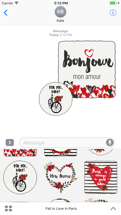 Ooh La La! Fall in love in Paris for iMessage Stickers is here to spice up your conversation this Valentine's Day. Get that spark going with these stickers. If you can't find this sticker/app once you have downloaded it, please do the following: 1. Click on the STORE icon on your iMessage App drawer 2. Click on the Manage tab inside the iMessage App Store 3. Look for Fall in Love in Paris for iMessage Stickers and turn on Switch Now it should be there in your iMessage App Drawer. If you have any suggestions or other questions, don't hesitate to send us a message at [email protected]. We are happy to help. Happy Valentine's Day! :) List of stickers available: - Bonjour mon amour - Bonjour - Take me to Paris - For you, Baby! - Mon Amour - Paris is always a good idea - Oh La La! - Paris - je t'aime (different versions) - Paris with Love - Kiss - Love - Happy Valentines Day