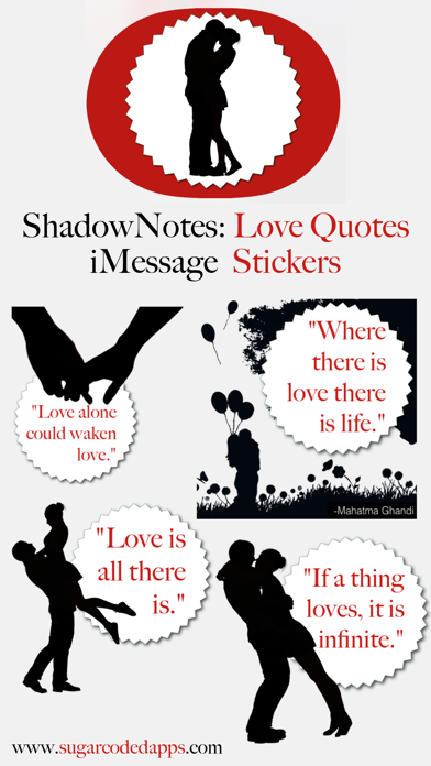 ShadowNotes: Love Quotes | Stickers for iMessage Perfect for Valentine's Day or any time you want to share a sweet sentiment of love. Over 30 classic short love quotes are coupled with beautiful silhouette artwork to create classy stickers that are cute to catch the attention of your significant other. You can peel & place these stickers on ANYTHING in your iMessage conversation... text bubbles, images, or even other stickers. Just one of the many great iMessage Sticker Packs now available from Sugar Coded Apps.