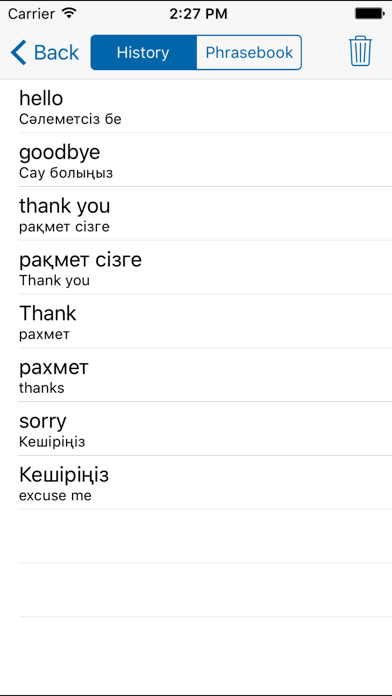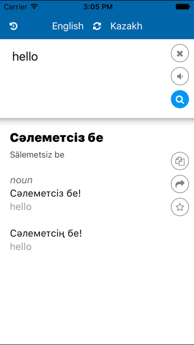 Free translator from English to Kazakh and from Kazakh to English This app can easily translate words and sentences will be translated from Kazakh to English,and translated from English to Kazakh. Product Features: - Translation of words and sentences.(Kazakh pronunciation is not support yet) - Voice audio pronunciation. - Find the clipboard sentence. - Translation results clearly definitions, can be used as a Kazakh(English) dictionary. - Search histories. - Share translate results. - Simple and user-friendly interface - Translate result with phonetic.