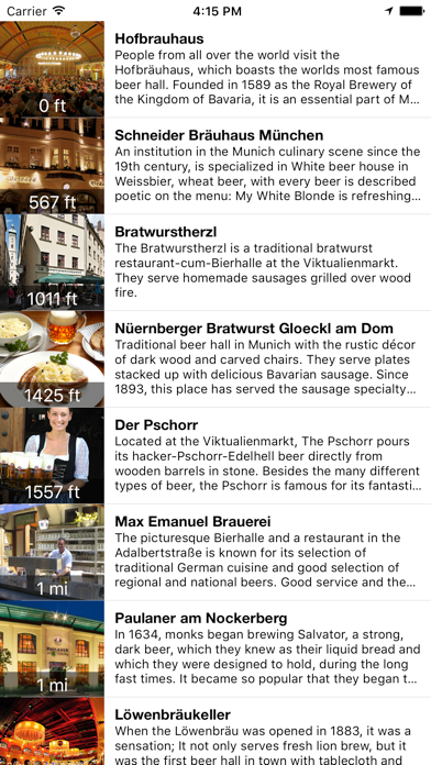 The MotorCo VR Guide to the Munich Beer Halls and Gardens is a GPS enabled location based guide to some of the famous Munich beer gardens and halls. It shows which restaurant is the closest to the user, and has an enabled Map which will take the user directly to the selected restaurant or pub. The app has no ads, pop-ups, registration and doesn't track the user's location. For centuries, the beer is and has been an important part of Bavarian cuisine and Munich and cultural heritage. Best choice "beer experience" has an authentic traditional beer hall (indoor) and beer garden (outdoor). The program has a list of many of the most famous ones. Location descriptions include: Hoffbrauhaus, Olympiapark Biergarten, Hirschgarten, Augustiner-Keller, Lowenbraukeller, MaxE, Hacker - Pschorr Brauhaus, English Garden, Nuerember Bratwurst Gloeckl am Dom, Paulaner Brauhaus, Weisses Brauhaus, der pschorr, Bratwurstherzl, Paulaner am Nockerberg and Waldwirtschaft GroBhesselohe.