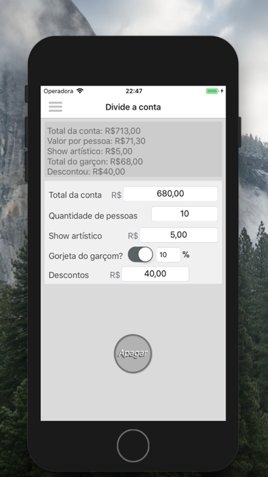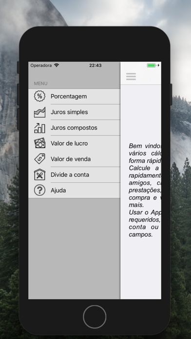 Este App vai te ajudar em vários cálculos do seu dia-a-dia de forma rápida e eficiente. Faz cálculo de porcentagem, juros simples e composto, faz simulação de financiamento direto ao consumidor usando o sistema de amortização Price utilizado por vários bancos , valores de compra e venda de produtos com margem de lucro. Calcula a sua conta no restaurante rapidamente dividindo o valor com os amigos, atribuindo o valor a ser pago por cada indivíduo, incluindo valores de serviço, show artístico e descontos. Usar o App é simples, digite os valores requeridos, pressione 'OK' para fazer a conta ou 'Apagar' para limpar os campos.