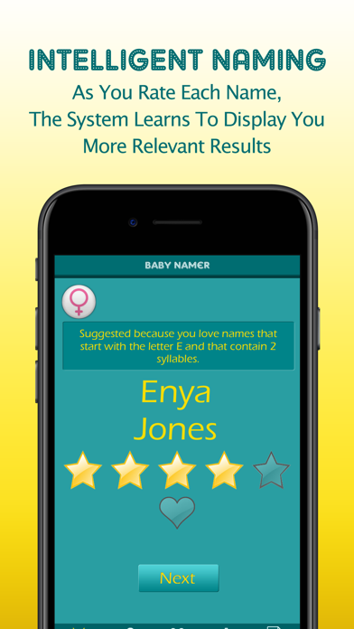 Baby Namer is a fantastic new way for you to find the perfect name for your baby! With our Baby Name Artificial Intelligence Engine, we'll help you locate a baby name faster by learning what you like and dislike so that the suggestions can improve over time. We'll show you the origins & meanings with our huge database of over 30,000 unique names. You can even connect with a partner or friend to automatically create a shortlist of favorite names! Baby Namer - Helping you get the perfect name for your baby. HOW IT WORKS:- • The suggestion tool will show you potential names based on your previous ratings, getting closer to the perfect name each time • After rating names, look at your insights to see what type of names you like • Connect with a partner or friend to share your ratings • Get notified about matches when you both love a name! FEATURES:- • Intelligent searching using Artificial Intelligence Engine. • Search and filter by letter, gender, syllables, origin and traits. • Over 30,000 names and meanings • Connect with a partner and quickly compare • View alternative spellings • See your insights based on how you rated the names • Check the popularity of any name • View meanings, origin and traits about each name FIND THAT PERFECT BABY NAME