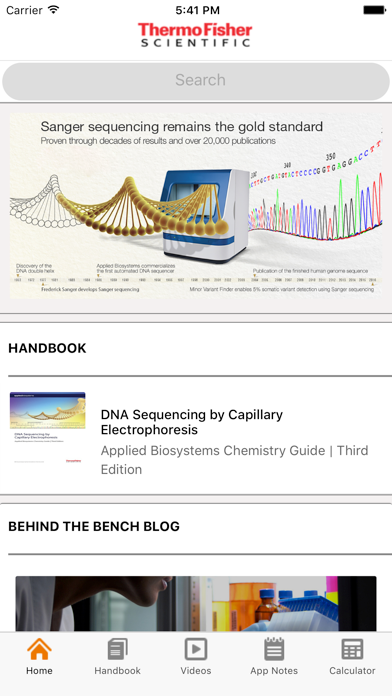 Sanger sequencing IOS application from Thermo Fisher Scientific. A handy tool for new or experienced users who perform automated DNA sequencing using Capillary Electrophoresis. This application’s main feature is a chemistry guide which covers all aspects of Sanger sequencing from the basic principles to workflows/ applications. Main features include: 1) DNA Sequencing by Capillary Electrophoresis, Applied Biosystems Chemistry Guide, 3rd edition (2016). Chapters include: o Sanger sequencing applications o DNA template preparation o Cycle sequencing o Purification of extension products o Capillary electrophoresis o Data analysis o Troubleshooting 2) How-to videos on every step of the Sanger sequencing workflow. 3) Popular videos from the Seq It Out, an educational video series that provides bite-sized answers to everyday sequencing questions. 4) Most recent application notes on Sanger sequencing. 5) Calculator for formulas referenced in the chemistry guide. 6) Direct link to Behind the Bench blog for the latest news, stories and updates on Sanger sequencing.