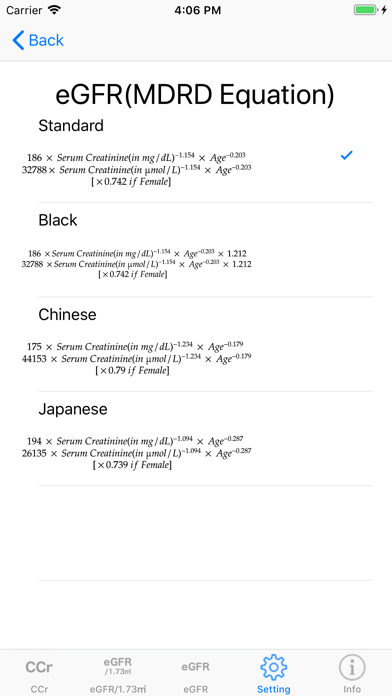 Easy-to-use creatinine clearance and eGFR calculator on a single screen. Please use for examination of drug dosage and evaluation of renal failure. You can select metric (kg, cm) or US Customary Units(lb, ft, inch) as the unit of weight and height. The unit of serum creatinine can be selected from mg / dL and μmol / L. Multiple MDRD formulas can be selected according to race. You can choose from several formulas for calculating body surface area.