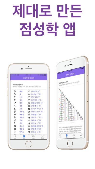 제대로 만든 점성학 앱이 드디어 나왔습니다. 기능이 지속적으로 추가됩니다. 1.0 버전의 네이털 차트 해석에 이어 1.2버전에서 호라리 점성술이 추가됐습니다. 지속적으로 트렌짓, 프로그레스가 추가될 예정입니다. 정확합니다. 천체력(ephemeris) 데이터 서버를 실시간 검색하여 결과를 출력합니다. 전문적입니다. 전문가들이 사용하는 천궁도 이미지, 출생 차트, 좌상 차트를 제공합니다. 풀이가 쉽습니다 서양 점성술 책을 번역한 티가 나는 난해한 문장이 아닌, 간단 명료하고 구체적인 표현으로 작성하였습니다. 점성학은 탄생 순간의 천체력의 데이터를 해석하는 기술입니다. 천체력 데이터를 사용하고 계산하는 방식은 장구한 세월동안 통일돼 있지만, 그 해석은 다양한 가능성을 가지고 있습니다. 점성학입문에서는 천체력 데이터를 기반으로 천궁도를 출력하고, 12사인, 12하우스, 좌상 등 출생 차트를 분석합니다. 더불어 버전업을 하시면 깊이 있고 이해하기 쉬운 풀이와 체계적인 해설서가 제공됩니다.