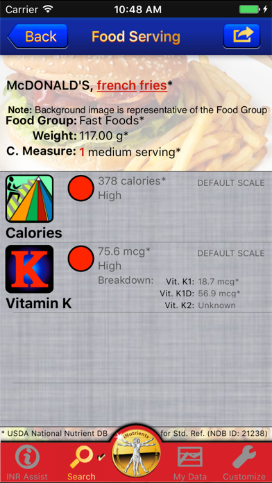 INR Assist will help those on blood thinners as it primarily allows users to keep track of their Vitamin K intake, which affects INR/PT results. Privately keep track of the foods you eat including data for 2 important nutrients ... this app provides lightning fast access to Nutrient data for 8,789 different foods and 15,438 different food servings based on the USDA National Nutrient Database for Standard Reference for the following nutrients: - Calories - Vitamin K — Vitamins K1, K1D & K2 These nutrients are listed in alphabetical order and will be presented throughout the app in this same order. The icons are from individual apps by the developer, each covering a single nutrient corresponding to the nutrients in this app. This app utilizes information taken from the entire USDA National Nutrient Database for each of these two nutrients, unlike the individual apps, which cover approximately 10% of what's available. You will find the Search functionality extremely fast as all needed infromation from the USDA database is local to the app — no internet connectivity is required. From the Search functionality you can save information for the foods you eat each day. You are able to pick a serving size and then either record a multiple of 0.1 – 9.9 servings; or optionally create a custom serving size from 1 to 500 grams. As you change the serving size you can graphically see the the effect on the various nutrients via color coding ranging from white to black (think burnt), and gray indicates data is not available: - Black — Extremely High - Dark Red — Very High - Red — High - Orange — Moderately High - Yellow — Moderate - Light Green — Moderately Low - Green — Low - Light Blue — Very Low - White — Extremely Low - Gray — Unknown The My Data section allows you to access up to a full year's worth of Food Serving Intake Items stored in your Personal iNutrients Database. For each day there is an Action button which allows you to copy all Food Servings to today's list. From the My Data section, select any Intake Item to get the complete information available. From this display you can tap the Action button in the upper right corner to: - Delete — Delete the current Food Serving. - Change Number of Servings — Change the number of Servings for the current Food Intake Item. - Change the Intake Date — Move the current Food Serving to another day. — This is extremely useful if you haven't been able to enter what you've eaten on the day it occurred; just simply enter it and then use this function to change to the date needed. - Copy Intake Item to Today — Copy the current Food Serving to today. The Customize section provides a means for you to create your own Custom Color Scale for each nutrient if desired. The rotating images occasionally seen on the right, on the iPad only, are representative of the 25 different Food Groups designated by the USDA. You will typically see versions of these images whenever a food group is identified. No Internet connection is required for basic functionality since the entire USDA National Nutrient Database for the two nutrients included as part of the app, which provides lightning fast response to searches. The user's personal data can be backed up and restored using iTunes on either a Mac or PC. Note 1: This app is based on the iNutrients app, but only includes the nutrients Calories and Vitamin K. Note 2: Functionality is the same as "Coumadin Assist" and "Warfarin Assist" apps, but documentation and labeling is customized for each.