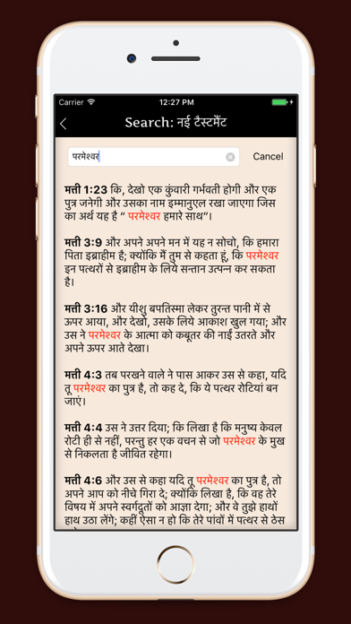 Hindi Holy Bible. Translation of the Old Testament and New Testament. As with Bible translations into Bengali (his own work), and into Oriya, Sanskrit, Marathi, and Assamese (with the aid of local scholars) an important early stage of the Hindi Bible rests with the work of William Carey in Serampore. Though this had to be revised by John Parsons of Monghyr. Carey attracted also the interest of Henry Martyn, later of Persia, to Hindi. Presbyterian Samuel H. Kellogg who taught at the seminary in Allahabad headed three translators working on translation of the Old Testament into Hindi, including William Hooper, of the Church Missionary Society, and Joseph Arthur Lambert. Kellogg's Hindi Grammar (1876, 1893) is still consulted today. However, 18 years after Kellogg's death in 1899, Edwin Greaves of the London Missionary Society, and author of a Grammar of Modern Hindi (1896, 1908, 1921), in 1917 signalled his concerns about the adequacy of Hindi Bible translations in his Report on Protestant Hindi Christian literature. Benefits of application: - The application works without an internet connection (offline); - Ability to search; - Ability to increase / decrease the font; - Ability to create an unlimited number of tabs to a particular verse, one of the books; - If you are interested in the allocation of poems you can copy or send a message; - Ability to scroll through the volume buttons. Our team is not in place, and aims to expand its functional applications. User guide: Each menu item is a separate book, and each separate page in one of the books is the chapter. Place the cursor instead of the chapter number and enter the chapter number. Thus, you will not have to scroll all the chapters, selecting interesting. Terms of Use - http://apple.nsource.by/terms-of-use.html Privacy Policy - http://apple.nsource.by/privacy-policy.html