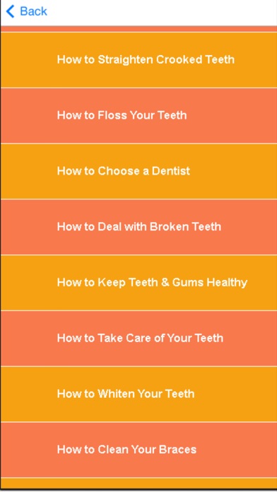 Learn How to Care for Your Teeth from this app. How to Care for Your Teeth How to Overcome Your Fear of the Dentist How to Floss How To Avoid Tooth Decay How to Prevent Dental Cavities How to Treat Sensitive Teeth How to Get Rid of Tooth Pain How to Strengthen Your Tooth Enamel How to Improve Your Oral Hygiene How to Deal With Wisdom Teeth How to Treat an Abscessed Tooth How to Afford Dental Implants How to Get Rid of Stained Teeth How to Treat a Dry Socket How to Prevent Bad Breath How to Get Rid of Gingivitis How to Whiten Teeth Learn How to Keep Teeth Healthy with the videos below: How to Brush Teeth Correctly How to Cope with Sensitive Teeth How to Have Good Oral Hygiene How to Cope with a Fear of Dentists How to Straighten Crooked Teeth How to Floss Your Teeth How to Choose a Dentist How to Deal with Broken Teeth How to Keep Teeth & Gums Healthy How to Take Care of Your Teeth How to Whiten Your Teeth How to Clean Your Braces How to Get Rid Of Bad Breath How to Get Healthy Gums