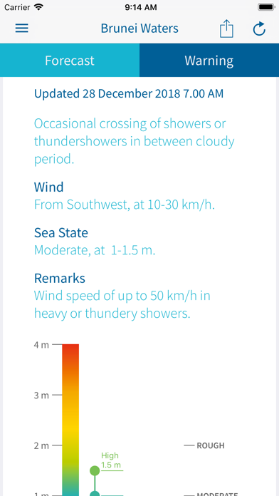 Get the latest local weather information from The Brunei Darussalam Meteorological Department, Ministry of Transport and Infocommunications. Its user-friendly features provide you with Brunei Darussalam’s weather forecasts; as well as weather reports from multiple local areas. You can also automatically get notifications for weather forecast and warnings issued by our Forecast office. The app has an option to change the language to Malay or English. You can also share the weather forecast and alerts to your friends and family through social media. The homepage has received a facelift in this new version. Know the weather condition of your favourite places by saving them as your favourite location in the app. Weather warning now has a customized notification sound. Brunei WX app features: ● Daily updates of general weather forecast for Negara Brunei Darussalam. ● Forecast temperature highs and lows. ● Forecast wind conditions of the day. ● 6-part Today’s forecast. ● 5-day weather forecast for Negara Brunei Darussalam. (NEW) ● Weather alerts for thunderstorms or heavy rain and strong winds. ● Weather Advisory. ● Forecast and warning for Brunei Waters. ● Radar images and animations. • Radar animation can be paused or play ● Satellite image. (NEW) ● Rainfall forecast. (NEW) ● Hourly weather conditions updates by location with addition of feels like temperature. (NEW) ● Add your own favourite location to know the weather condition at a certain place. (NEW) ● News and Information. ● Share button to social media ● Option to change language to Malay or English ● Calendar View (NEW) • Events held by BDMD will be posted here. • Brunei Weather Watch will be shown in the calendar.